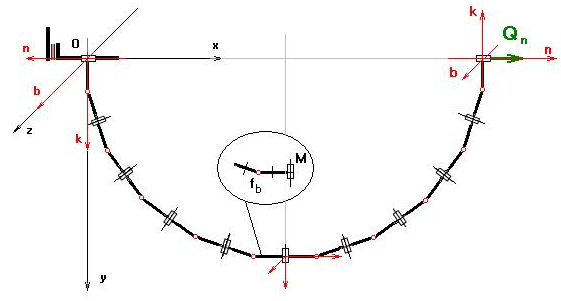 - Ориентация опор, нагрузки и выводимой информации производится в связанной, Oknb, системе координат элементов, на которые разбиваются участки рассчитываемой конструкции.. На рисунке приведён пример деления на элементы балки, состоящей из одного участка.