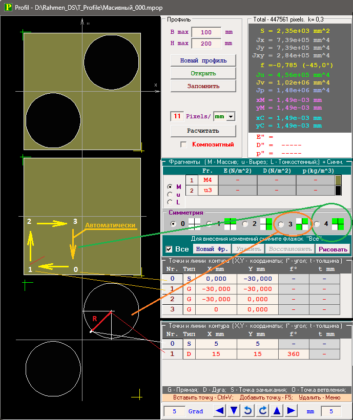 Помимо геометрической информации в описание профиля включена информация о материале его фрагментов ( E – Модуль продольной упругости, D – Модуль сдвига, р — Плотность материала, Цвет — Цвет окрашивания ). Эти данные необходимы для расчёта характеристик композитных профилей.