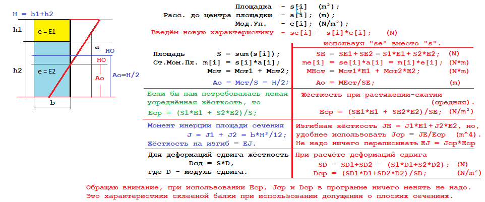 Если эти данные отсутствуют и/или снят флажок «Композитный» то будут использованы E, D и р указанные в таблице «участков». Если переключатель включен, то в расчёте будет использован рассчитанный центр тяжести композитного профиля и усреднённые по приведённой ниже схеме E, D и р.