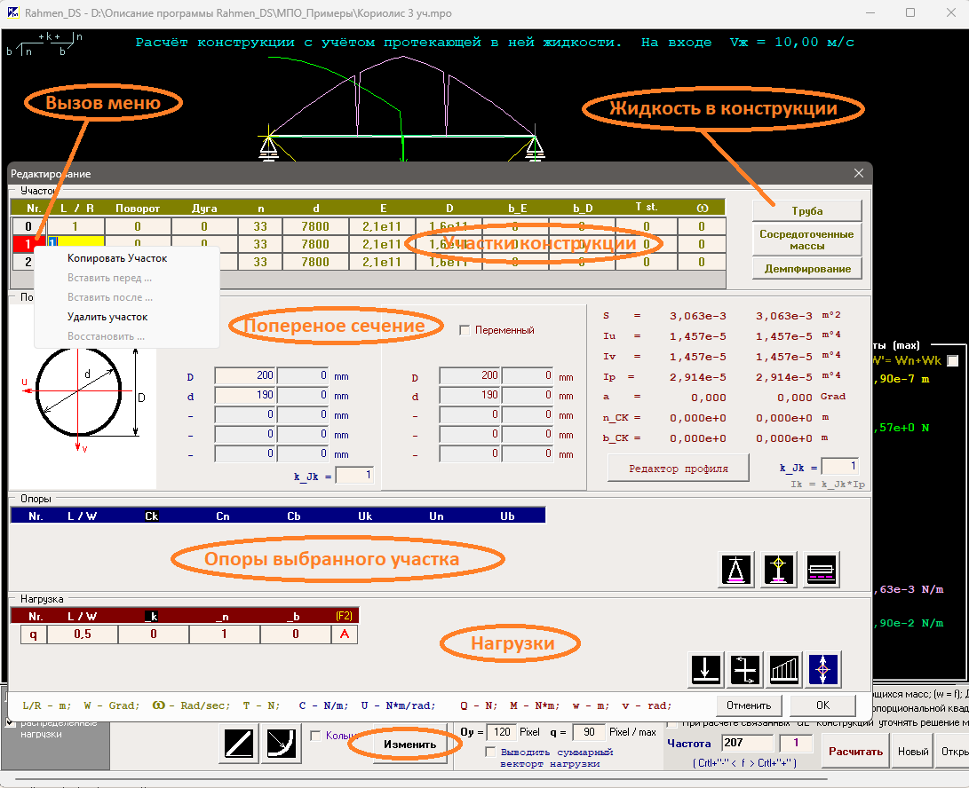 - При нажатии кнопки "Труба" редактируются потоки жидкости всех участков конструкции