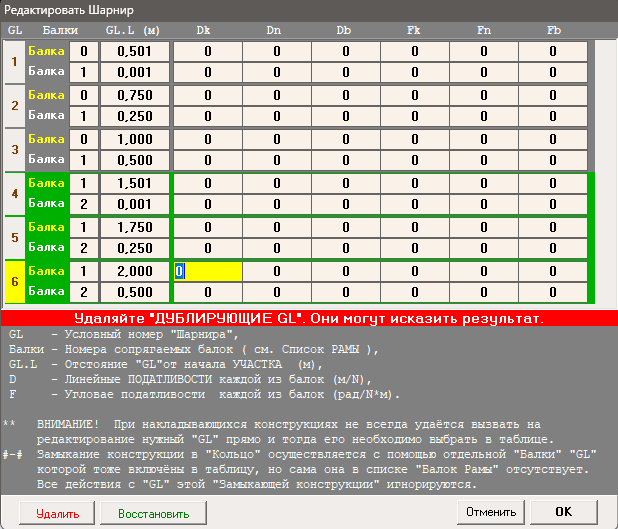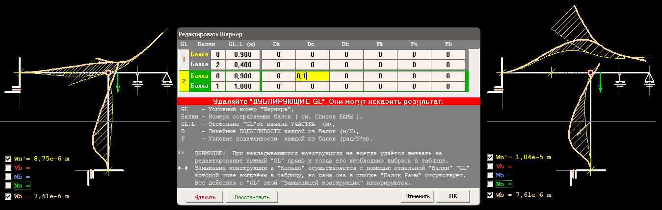 К назначению величин "Податливостей" шарниров следует подходить осмотрительно; слишком податливые шарниры могут превратить "Раму" в "Механизм".