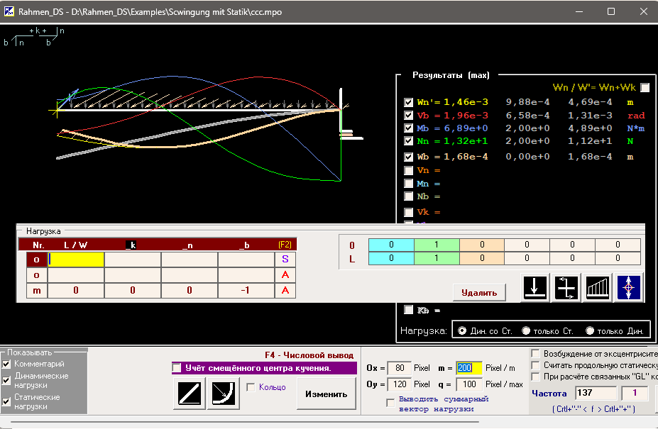 - Казалось бы, для расчёта статических деформаций достаточно задать частоту возбуждающей нагрузки Q*cos(ω*t) - ω=0. Однако, если среди нагрузок есть имеющие смещение по времени Q*cos(ω*t+ϕ) это будет не вполне корректно, так как мы проводим расчёт вынужденных колебаний пусть и с ω=0. И, если нас интересуют только статические деформации надо быть внимательным. Программа допускает расчёт колебаний конструкции относительно её статически деформированного состояния совмещая две отдельные задачи и позволяет часть "Нагрузок" задать как "Статические". Она сама рассчитает "Статически деформированное состояние" конструкции при действии только "Статической" нагрузки, внесёт в конструкцию необходимые изменения и рассчитает колебания при действии на неё "Динамической" нагрузки с частотой ω ( Это 2 отдельных РАСЧЁТА. Для сравнения добавлен расчёт исходной конструкции при действии только "Динамических" нагрузок) . В качестве общей линии отсчёта используется недеформированная конструкция.
