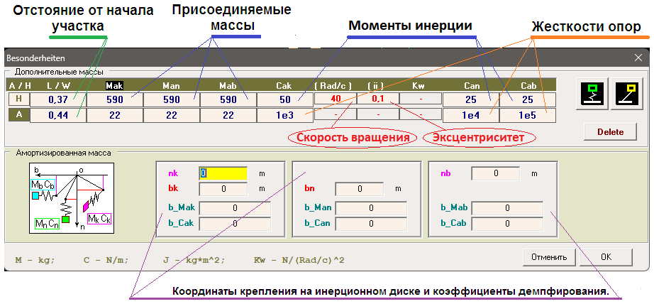 Присоединённые (Н) – жёстко закреплены на инерционном диске, но могут иметь отличающиеся значения масс при движении по направлениям разных осей местной системы координат (Mhk, Mhn и Mhb) и не совпадающие, при этом, центры этих масс (nk, bk, bn и nb). Как, например, при колебаниях в жидкости (при каждом возможном перемещении своя, действующая только на этом перемещении, присоединённая масса). Учитываются также присоединённые моменты инерции (Jhk, Jhn и Jhb) и демпфирование через коэффициенты внешнего линейного сопротивления „b_M“ и „b_J “. Кроме того, для этих масс могут быть назначены скорость вращения относительно продольной оси и эксцентриситет для моделирования винтов, дисков турбин и т.п..