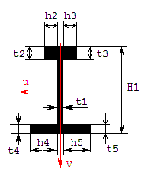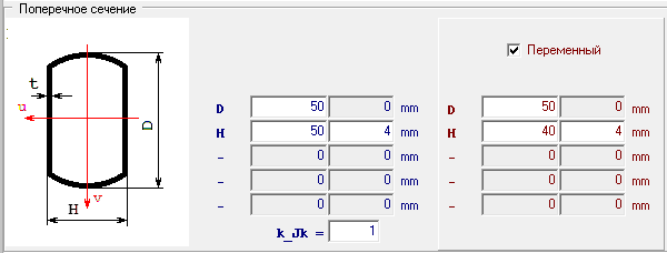 1 – Пользователь задаёт величины площади поперечного сечения „S“, её главные центральные моменты инерции „Iu“ и „Iv“, угол между осями "Ou" и „Ob“ и положение центра кручения, если он не совпадает с центром тяжести профиля, самостоятельно.